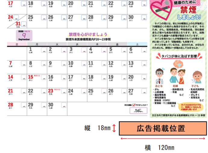 縦18mm×横120mm。カレンダー見開きページの右下に掲載予定です。