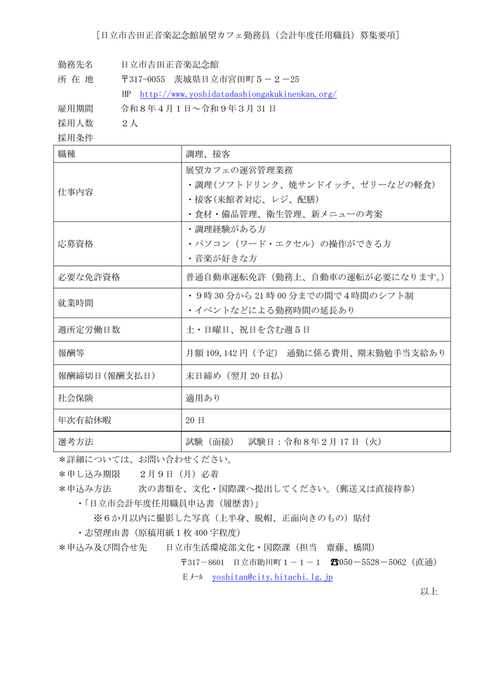 展望カフェ勤務員(吉田正音楽記念館)の募集について